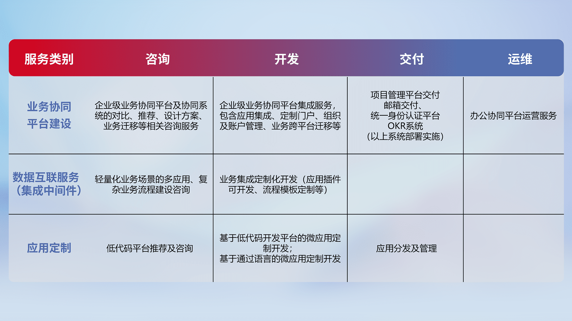 针对钉钉、、、、企微、、、IDaas等平台级产品提供产品的规划、、、方案、、、、交付、、定制化开发等服务,,,实现如统一协同办公、、智能客户服务、、、混合会议管理、、智能数据查询、、等业务场景,,实现数字化转型。。。